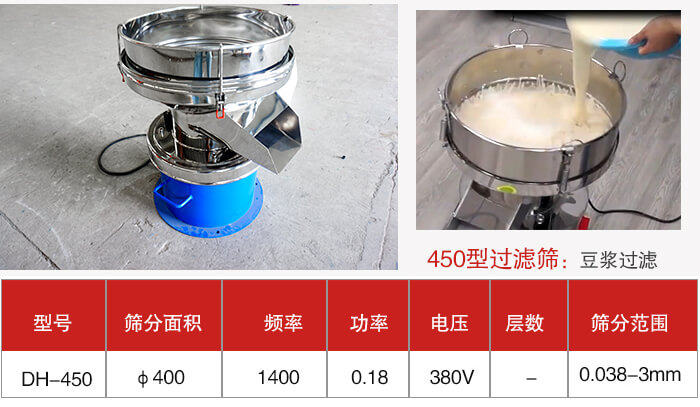 1、450過濾篩:時產量300公斤-500公斤/h,篩分粒度0.038-5,外形尺寸360×300×470mm。