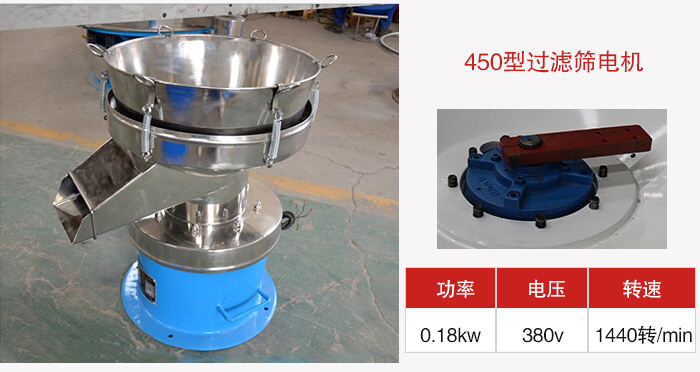 1、450液體過濾篩:電機功率0.18kw,電壓380v,轉速1440轉每分鐘。
