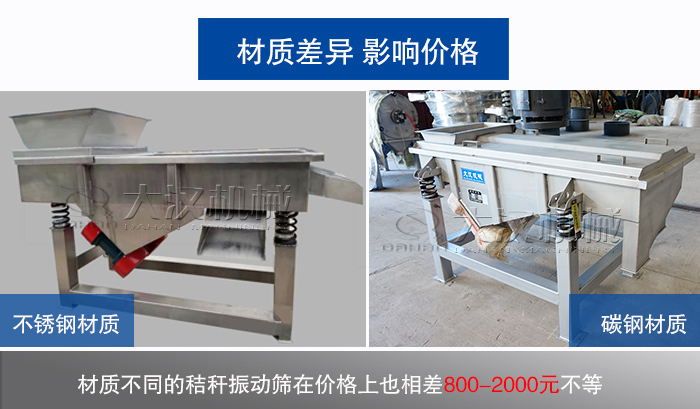 養(yǎng)殖場飼料篩分直線振動篩主要有碳鋼與不銹鋼兩種,材質(zhì)不同的秸稈振動篩在價(jià)格上也相差800-2000元不等。