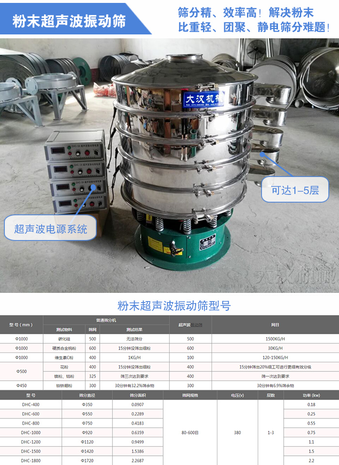 粉末超聲波振動(dòng)篩型號有:DHC-600、DHC-800、DHC-1000、DHC-1200、DHC-1500、DHC-1800等,層數(shù)可達(dá)1-5層(可根據(jù)用戶的要求特殊定制)適用于400目、500目、600目超細(xì)物料的篩分、除雜、過濾、分級。