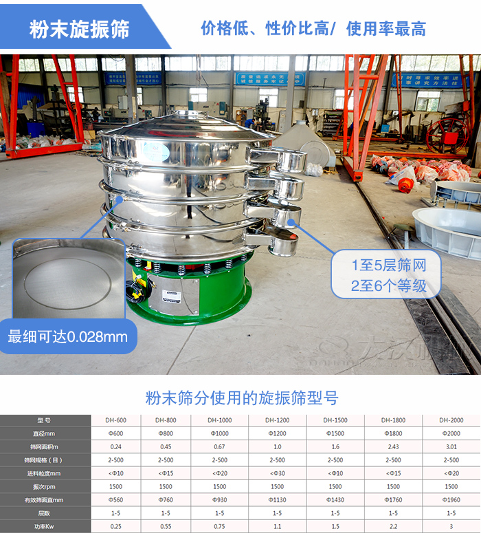 粉末篩分使用的旋振篩也叫做三次元振動(dòng)篩,型號有:DH-400型、DH-600型、DH-800型、DH-1000型、DH-1200型、DH-1500型、DH-1800型、DH-2000型等八種標(biāo)準(zhǔn)機(jī)型。