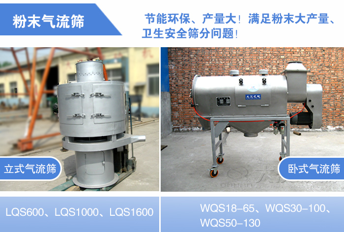粉末氣流篩有立式和臥式兩種,立式氣流篩的型號有:LQS600、LQS1000、LQS1600;臥式氣流篩的型號有:WQS18-65、WQS30-100、WQS50-130,用材質(zhì)有不銹鋼和碳鋼(可根據(jù)用戶的要求特殊定制)