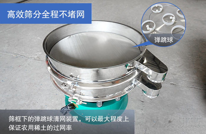 圓形振動篩通過振動電機上兩端的偏心塊將篩機運動轉化為三元運動對農用稀土進行高效篩分,再加上篩框下的彈跳球清網裝置,可以很大程度上保證農用稀土的過網率,高效篩分全程不堵網。